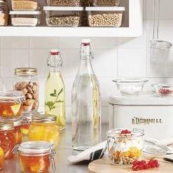 Make delicious homemade dressings, flavored vinegars, and infused oils with the Bormioli Rocco 33.75 oz Swing Top Glass Bottle. The swing top lid creates a hermetic seal for preserving and aging your oils and vinegars. This 12 inch tall oil bottle is the great for displaying your bottled oils and vinegar creations in your kitchen and on your tabletop. Since the swing top bottle fastener is made from metal wire hand washing is recommended.