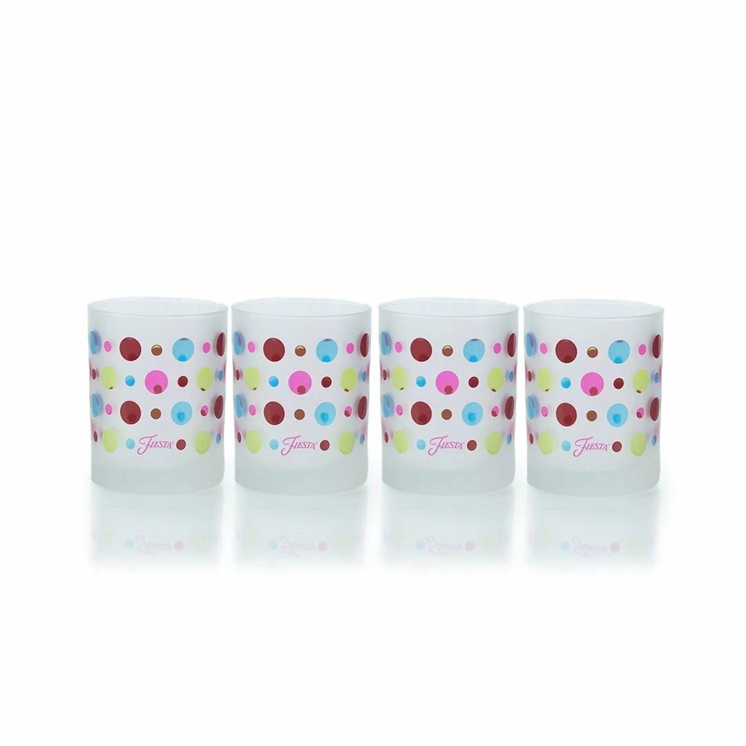 Serve your favorite beverages in fun and festive Fiesta® colors with the 14oz. Multicolor Dots Double Old Fashioned Glasses Set! Crafted of lead-free high-quality glass and proudly made in the USA, these frosted glasses have thick & sturdy bases for muddling ingredients, making them perfect for serving cocktails like a Whiskey Sour or an Old Fashioned. With a fun dot design in Scarlet, Lapis, and other signature bright Fiesta® colors, these glasses will look great with any of your Fiesta® pieces or as a colorful accent with your existing dinnerware. Add a pop of color to your dinnerware collection with the Fiesta® Multicolor Dots Double Old Fashioned Glasses Set today!