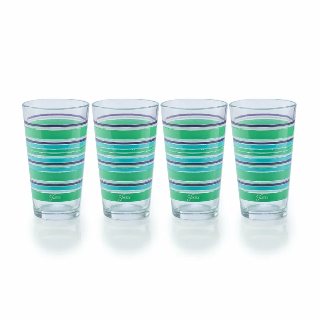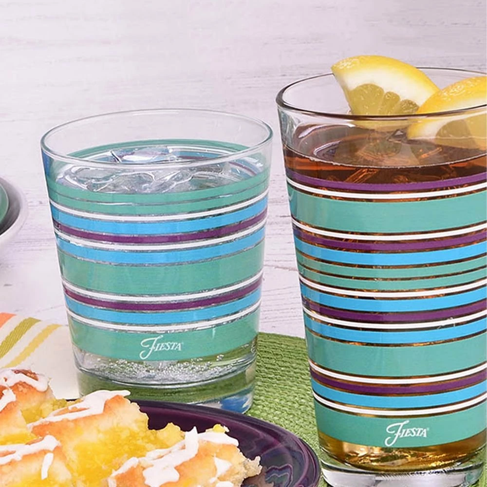 Iced tea, chilled water, or a classic Bloody Mary at brunch are all better enjoyed in this fun & festive Fiesta® Farmhouse Chic 16 oz. Cooler Glassware Set! With Turquoise, Meadow, Mulberry, & White stripes, these glasses will look great with any of your cool Fiesta® color combinations, or they can bring a fun pop of color to the table when you’re using neutral dinnerware. With a wide rim and a tapered shape, they’re the perfect all-around drinks glasses. Add a pop of color to your dinnerware collection with the Fiesta® Cooler Glasses Set today!