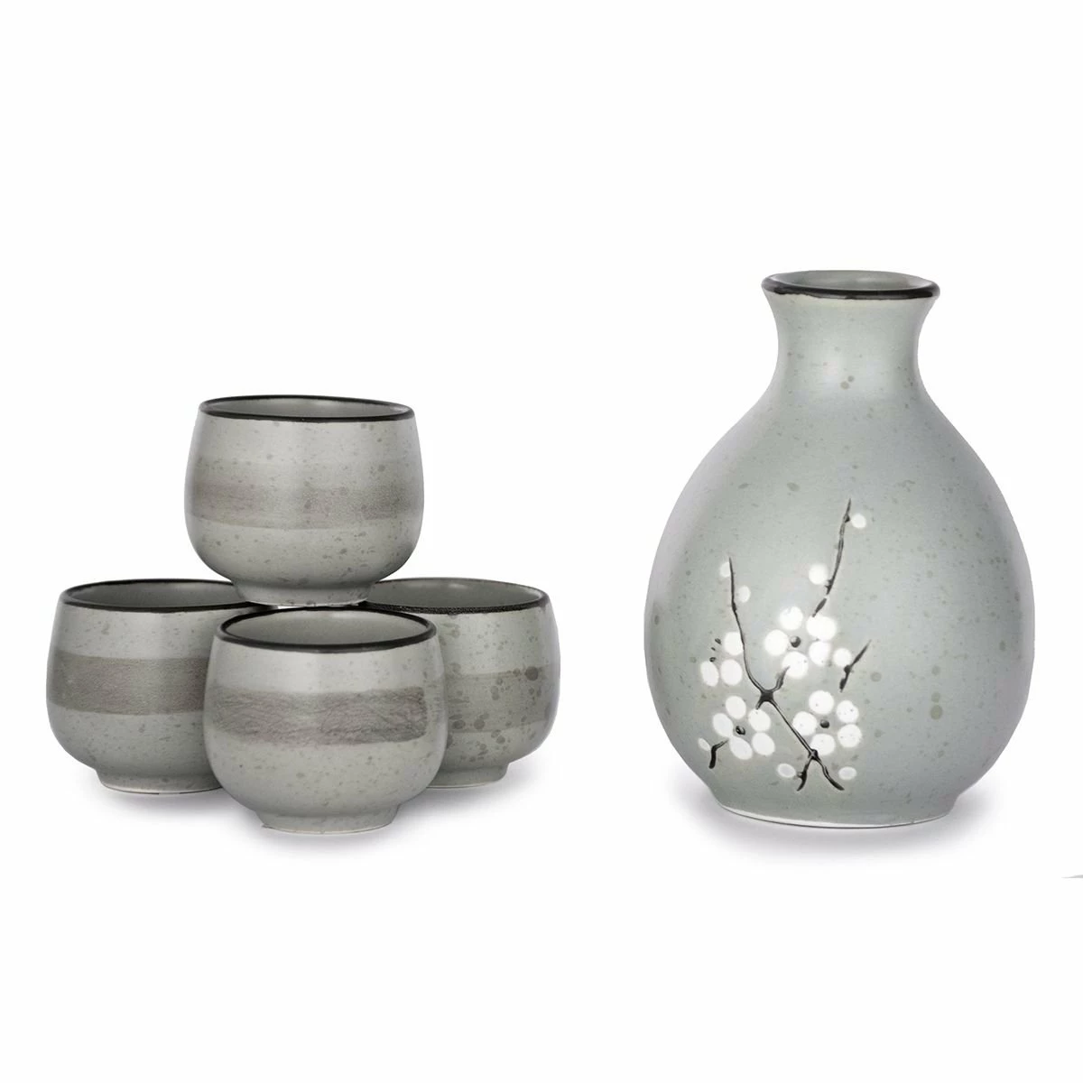 Bring an authentic touch of Japan to sushi night or savor a special occasion with this traditional 5-Piece Sake Gift Set (Sakura) from Fuji Merchandise! Crafted of durable ceramic that is both microwave- and dishwasher-safe, the set includes an 9.5oz tokkuri (decanter) and four 1.5oz sake cups that can be used to serve sake either hot or chilled. The set features a graceful white cherry blossom motif over a soft gray background and makes a beautiful housewarming or special-occasion gift.