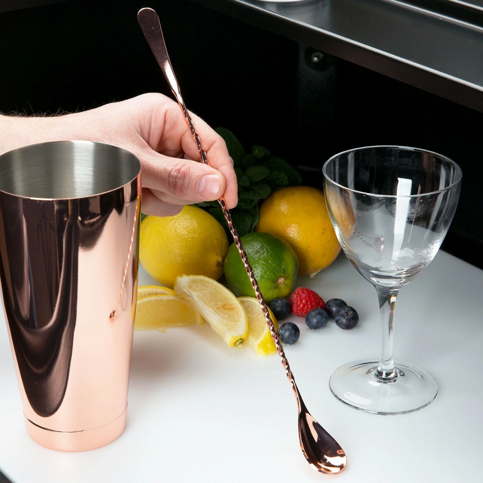 Whether its classics like Old Fashioneds, whiskey sours or martinis or something a bit more trendy – think pumpkin spice Moscow Mules – mixing drinks for your cocktail-loving friends starts with reaching for professional-quality bar tools from Barfly Mixology Gear by Mercer. Show your deft hand at smoothly mixing cocktails made to order or by the pitcher with the Mercer Barfly 13.2” Copper-Plated Japanese-Style Bar Spoon M37010CP. Barfly’s handsome bar spoon is made of a single piece of Copper-plated stainless steel that won’t absorb stains or odors that could cloud the taste of fine spirits. This dual-use bar utensil has a precision-molded spoon on one end for accurate measuring, precise pouring, and gentle stirring; the other end is a slightly concave “Japanese Style” machined edge to expertly transport and mix small quantities of garnishes and ingredients. The elegant spiraled handle is designed with a twist to gently blend without bruising, and at a stately 13.2” long, it’s perfect for tall drink glasses and pitchers. With such alluring looks and expert performance, Barfly Mixology Gear by Mercer can turn your kitchen into the neighborhood’s trendiest cocktail lounge.