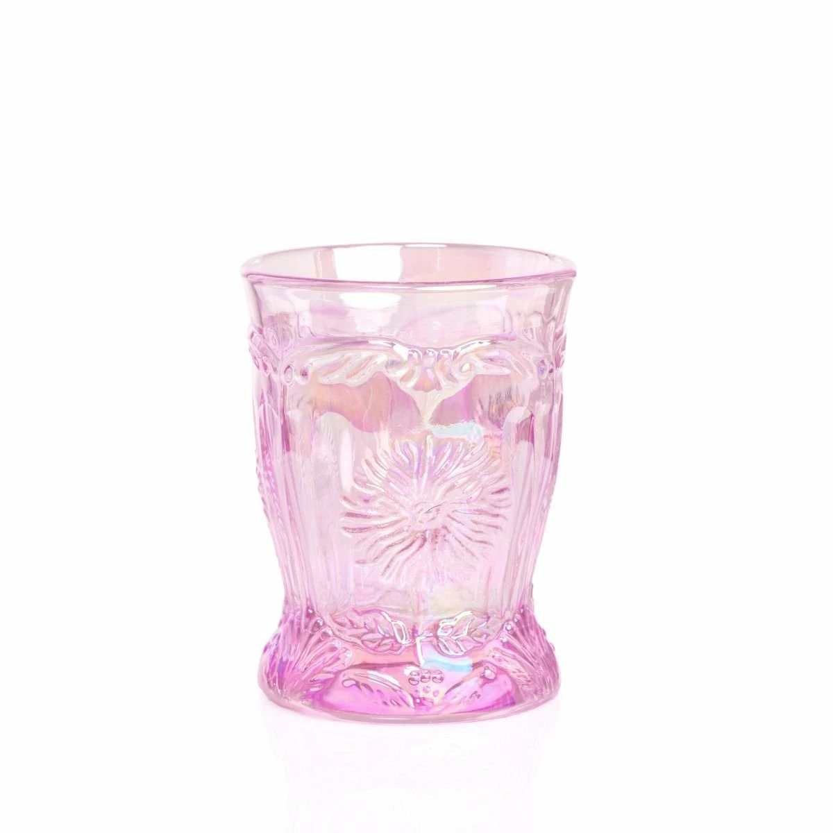 Sip lemonade on the porch on a hot summer day served in the Mosser Glass Dahlia 8oz Tumbler (Passion Pink Carnival)! Made from high-quality, hand-pressed glass, this carnival glass tumbler brings a mesmerizing pop of color to any table. The embossed dahlia flower design adds a charming and unique flair. Mosser’s signature hand-pressed glass undergoes an extensive firing, molding, pressing, hardening, and polishing process, resulting in beautiful high-quality craftsmanship. The vibrant iridescent pink color, glossy smooth finish, and classic design make this a timeless piece that you’ll find yourself reaching for every time. Add a stunning piece of vintage-inspired glassware to your collection with the Mosser Glass Dahlia 8oz Tumbler (Passion Pink Carnival)!