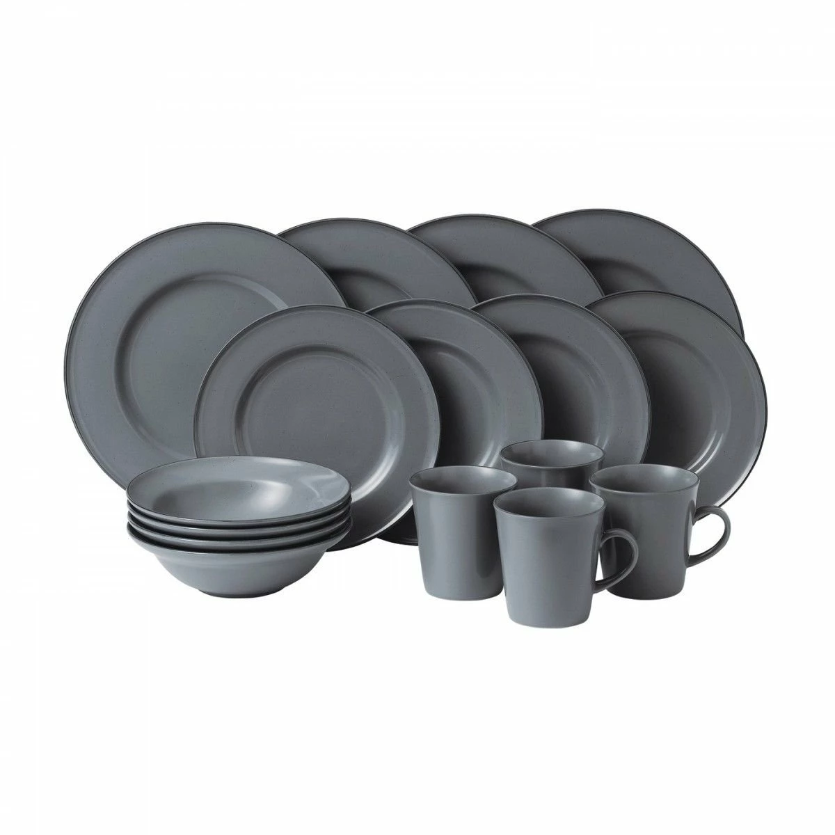 - Set includes four dinner plates, salad plates, cereal bowls, and mugs